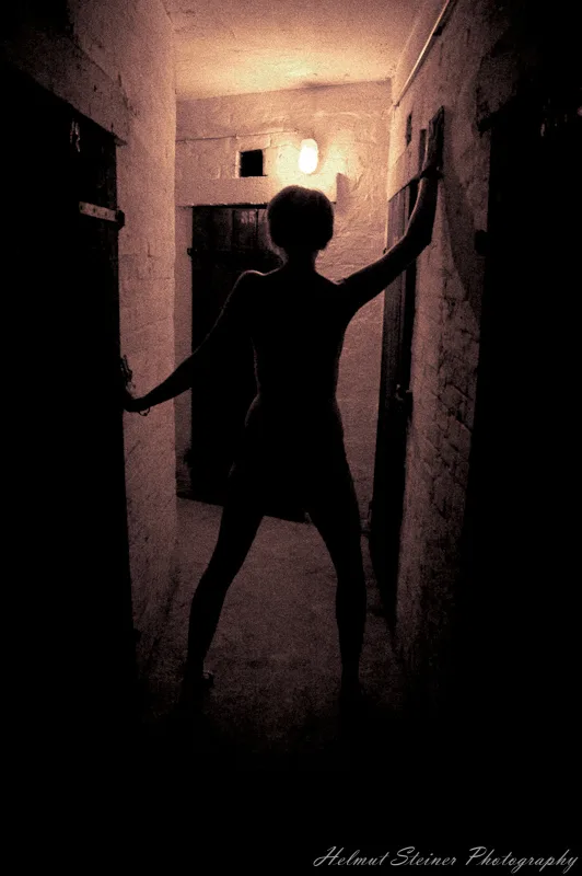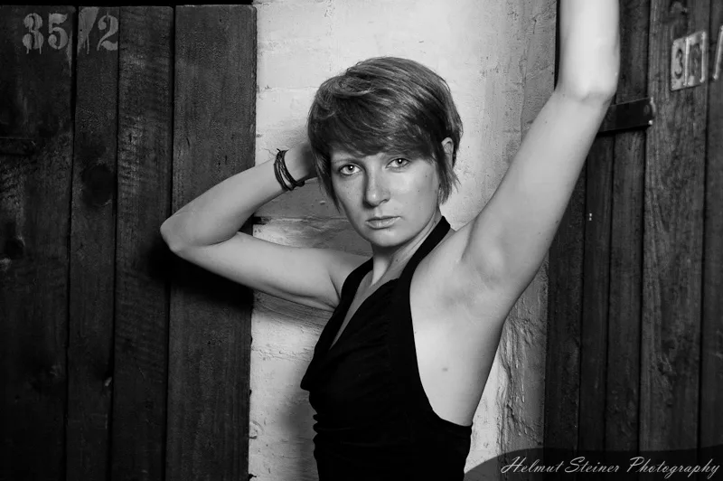 After carrying Steffi’s stuff downstairs the whole morning, I figured out that the basement would be a really neat location for a shoot. Well,… So I put on a magic square softbox onto my strobe and we went downstairs. Steffi became my official human light stand. :D