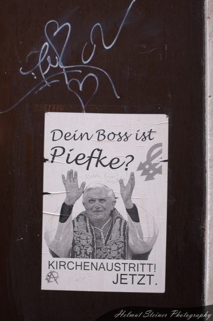 Walking down the street to Heldenplatz we found this small poster on a wall. It says: „Your boss is a Kraut? – Quit church! Now.“
