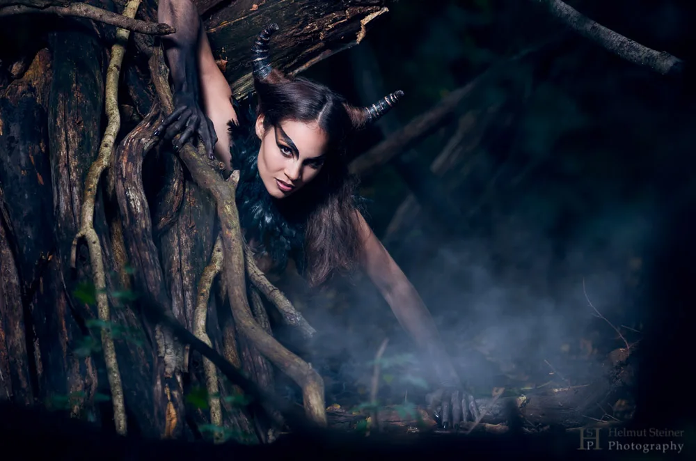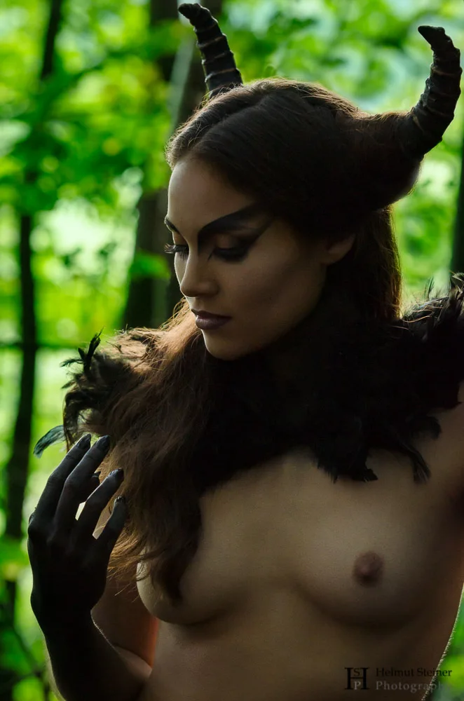 Make-Up Artist Aruni and I wanted to do some fantasy inspired photos. We settled on creating a daemon like creature with horns and feathers… Shopping time! There is a big textile shop on Mariahilferstraße in Vienna where they sell all types of textiles. We bought a roll of feathery clothing and Aruni sewed a short dress and a shoulder piece. The horns are made out of paper towel rolls.